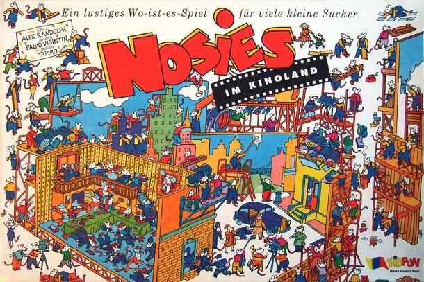 The little "nosies" are all over movieland - seemingly hundreds of them in various movie costumes all over various movie sets. Kids take turns drawing image disks out of a bag and try to locate the image on 3 large "Where-is-Waldo?"-like boards. Once a player finds the image he/she will slam their magnifying glass onto it. If it's correct, the player gets...