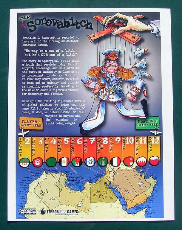 A rapid-fire "print-and-play" game where players have to sell arms to various unsavoury customers across North Africa and the Middle East. The order of play is through a series of quick rounds, with both players racing to claim territories - either as selling opportunities or to shame the opposing player for already selling weapons there. The tricky...