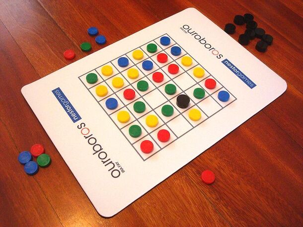 Ouroboros is an abstract strategy game for 2-4 players, best with 2 players. Players start with no discs, and gain discs from other players during gameplay. Ouroboros is played on a 6x6 grid filled with four-colors of randomly placed discs. On each player's turn, they do one of three things: 1) Choose a square with a disc in it to place a stone there...