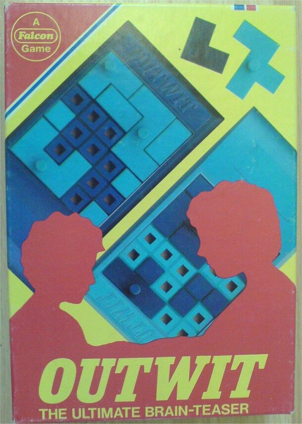 From Box Back: "Two players can take part in the game the object of which is to be the first to complete the puzzle. Outwit is a fast, challenging game where the perception, imagination and intelligence of each player is tested. "The box contains 2 plastic boards, 16 big plastic pieces of various geometrical shapes, 4 rectangular pieces and 12 small square...