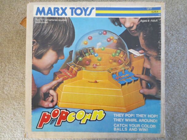 A dexterity game in which a domed center containing 4 colors of marbles is then automated with 2 D cell batteries to begin to "pop" and move. On each of 4 sides of the dome is a row of slots for each player and colored to match each of the balls or popcorn; blue, green, white and red. In front of each slot is a button and if pressed will push out the...