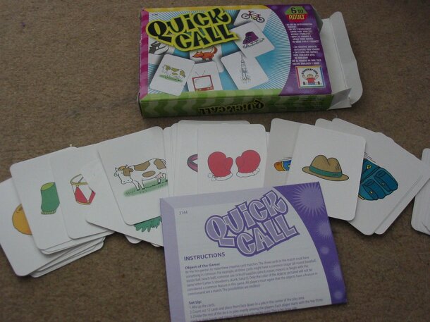QuickWits is a fast-paced card game based on naming items within certain categories and descriptions. The game is very similar to Anomia, but the content is more mature in theme. During the game, players take turn drawing a card and placing it in front of them. Each card has one of six different symbols on it, and when two players have the same symbol on...