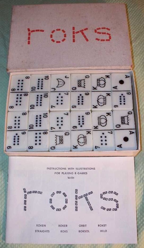 Roks are domino-like pieces with Ace - King characters on each end. There are 36 pieces in the complete set. There are eight games you can play with Roks: Rokem - similar to normal dominos Roker - variation to Rokem Roket - Played with only 28 pieces and players bid on hands, using trump suits. Orbit - 6 player bidding game played in teams, Roks - 4 player...