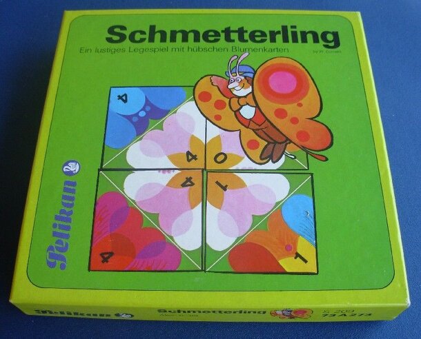 Schmetterling (=butterfly) contains 44 flower tiles, 20 butterfly tiles and 4 tokens for each player. The flower tiles are diagonally separated into 2 halves showing two parts of a flower. Both halves have also a number on it (0-4). The butterfly tiles have numbers from 4 - 24. Tiles are laid on the table like in dominoes: flower parts must have the same...