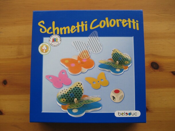From rules booklet: "Colour and pattern recognition and a bit of luck with the dice are what you need to collect the lovely brightly coloured butterflies. This game goes a step further and not only promotes colour recognition but also presents the secondary colours orange, green and purple in a playful manner. Learning colours with the aid of the...