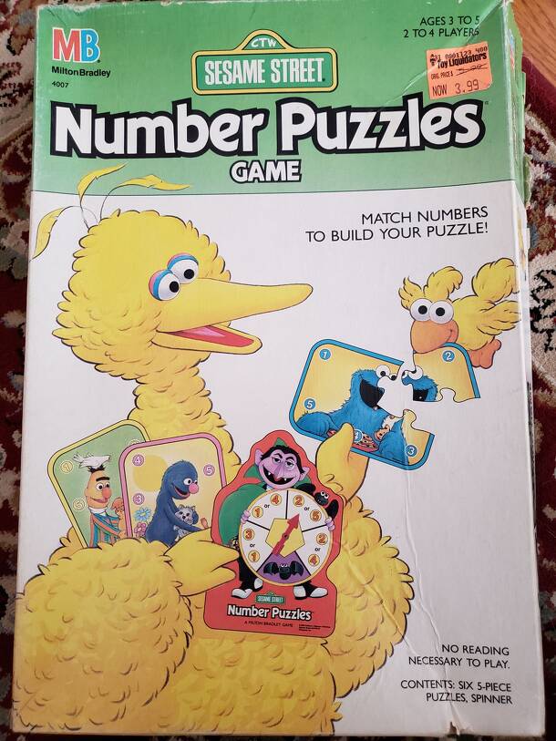 This is a children's puzzle building game with a Sesame Street theme. Each piece in a puzzle has a number on it. To begin, you must spin a "1" or "Wild" on the spinner. You then take the #1 piece of a puzzle and place it in front of you. After that, you may collect pieces in any order, assembling them as you collect them. Each area on the spinner has two...