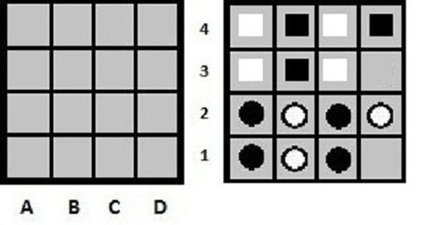 Sophia is played on a 4x4 square board. Each player has two sets of 7 pieces. Each set is a different shape. One side of every piece is one color, and the other side is a different color. (So that for instance one player has triangles with one side black and the other red, and the other player has squares, also with one side black and the other red). Each...