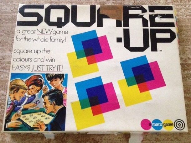 Square Up is a pattern matching game using a 2x3 portion of a 3x3 gameboard. Four players are shown on box top, but it may be possible that as few as two could play. The players are dealt cards intended to match patterns on the board. The colors in the 3x3 matrix could be changed one at a time by rotation of an associated knob on the board. Assumable a...