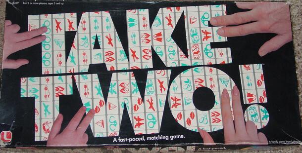 From the Box: "Take Two! is a fun-filled game for 2 or more that's a new game every time you play. Arrange tiles randomly on the board, then start grabbing. Everyone plays at once, grabbing matched pairs off the ends of the rows until the board is empty. Whoever has the most matched pairs wins. But choose carefully--and take a second look, because some...