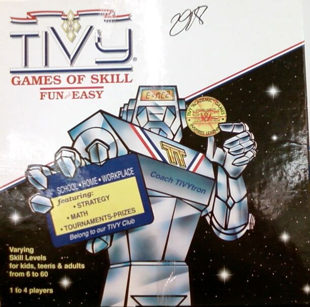 Game components include many wooden dice shaped pieces called "tivots" with differing numbers on each face. Tivots are moved on the plastic playing board to gain ground and complete equations. The game is scalable from basic addition to algebra with different templates. From product description: TIVY is a math board game invented by an Oklahoman. The game...