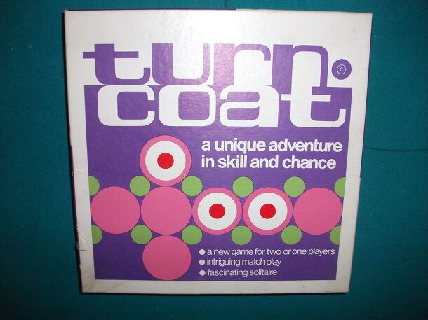 "Turncoat is a unique new game. The board and counters can be used to provide the means of playing fascinating solitaire, or engaging an opponent in an intriguing battle of wits." The game consists of a board and ten counters. The counters are marked on each side with red and green designs on a white or black background. Each counter has white on one side...