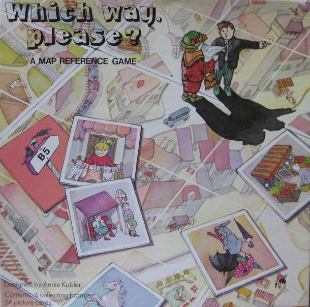 Which Way, Please? is a map reference game for children Ages 4 and up. It is designed to teach small children about the concept of grid maps. It consists of six collecting boards divided into nine grid squares, and 54 picture cards that magnify the village images on the collecting squares. The picture cards have grid references on their backs. There are...