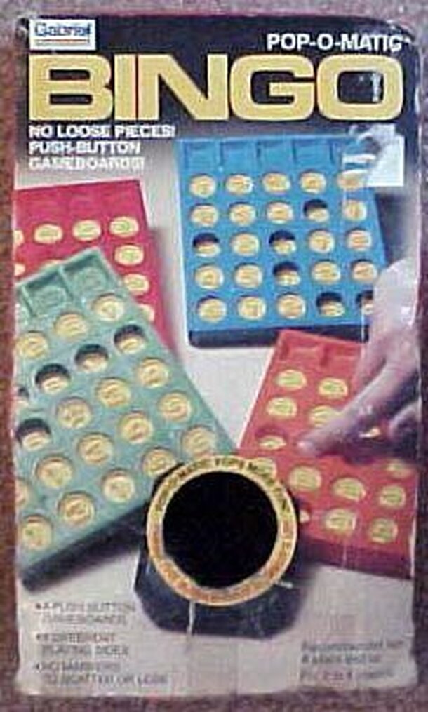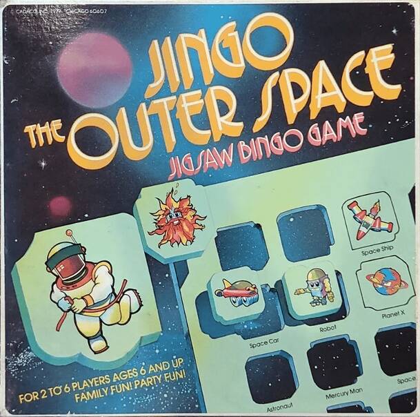 Another Jigsaw Bingo Game of the same publisher of Jingo. Each player receives a cardboard "board" with a 5x5 grid that has variously shaped pieces punched out of it. The pieces are dumped into the middle of the table and all plays simultaneously try to be the first to fit five pieces in a row to win the round. Winner of the round scores 10 points plus 2...