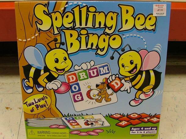This game helps young children to learn the alphabet and read simple words. Each player takes a bingo card that has two words on it. Letter tiles are drawn from a bee shaped tray and called out. If the letter is on your card you cover it with a chip. The first player to cover all the letters on their card wins. There are also spelling cards that can be...