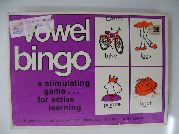 From the instructions: "Vowel Bingo is a fun-filled way to strengthen and reinforce vowel skills. Each playing card contains eight labeled illustrations of objects having long or short vowel sounds in their names. The purpose of game play is to match each object's game with its correct vowel." Vowel Bingo is similar to standard bingo, but in order to place...