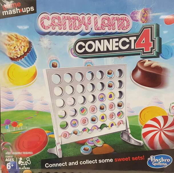 It's a Game Mashup: Two favorite brands come together to create one awesome game. This Connect 4 game has a Candy Land twist. Players take turns knocking out plastic candies from the bottom row of the Connect 4 frame. Each time one gets knocked out, a new disc must be placed in one of the slots at the top of the frame. The plastic candy tokens keep moving...