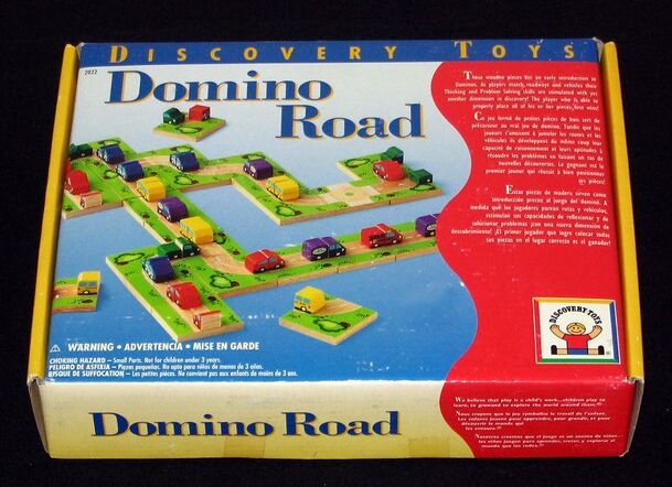From the box front: These wooden pieces are an early introduction to Dominoes. As players match roadways and vehicles their Thinking and Problem solving skills are stimulated with yet another dimension in discovery! The player who is able to properly place all of his or her pieces first wins! From the box back: Domino Road is a wonderful addition to the...