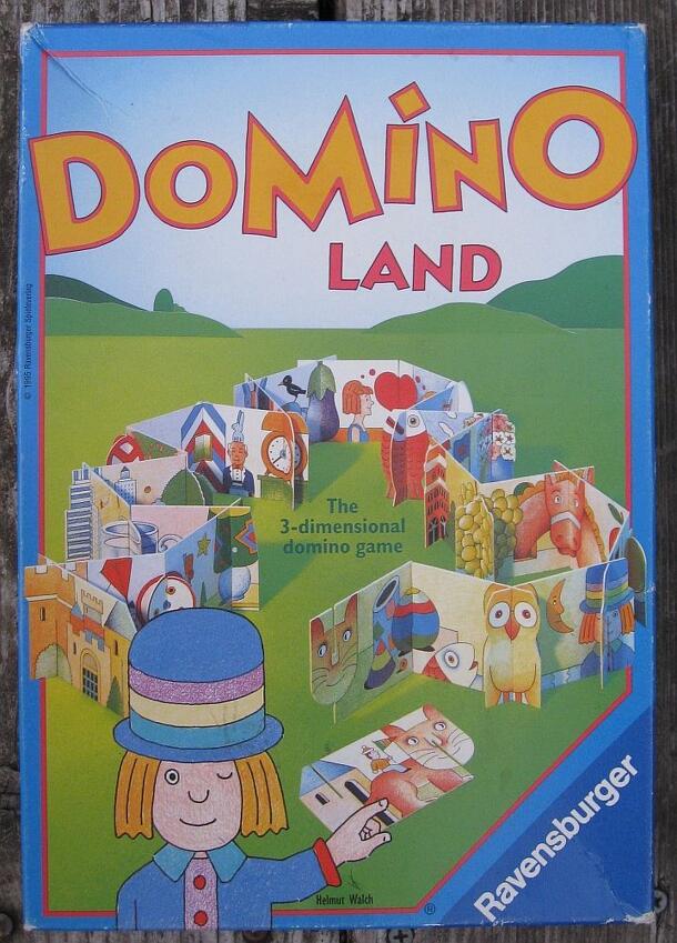 Domino Land is a variation on traditional dominoes for young children. Description from the rules: In Domino Land the cards are slotted inside each other and built upwards rather than laid in a row. Fitting the cards together in this way means that you can make creative 3-dimensional designs: a colorful ball here, a heart over there, a cat in between - and...