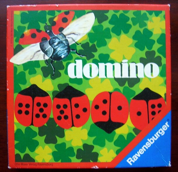 Glückskäfer Domino or Ladybug Dominoes is a German children's game that uses cards shaped as ladybugs with unique spots on their wings. Ladybugs can be turned forward or backward to match spots as they are placed in a row. The first player to place all their cards is the winner. The English name of the game on the side of the box was mistranslated as...