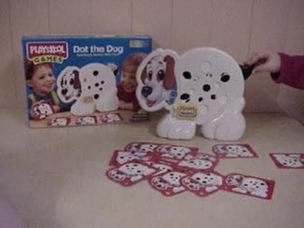 This memory/matching game uses a plastic Dalmatian with holes in its side. Behind the holes is a wheel with spots on it. On your turn, you press (wag) the dog's tail to cause the wheel to turn. You then examine the spot pattern that shows through the holes and must find the Puppy Card with the matching pattern on the table. As an optional rule, all players...