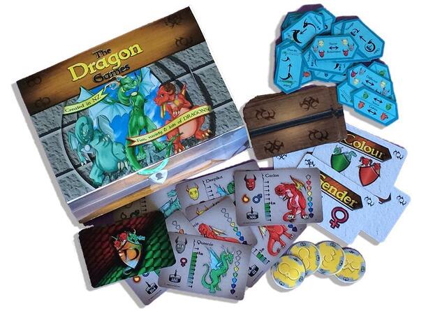The Dragon Games is a collection of four events all using the specially designed Dragon cards. Each card describes a unique dragon, with a name, colour, gender, age, strength, height, breath-type, behaviour and number of horns. There are also 12 Attribute cards, used in two of the games, 36 cardboard connectors, used in one game, and 12 gold medals, for...