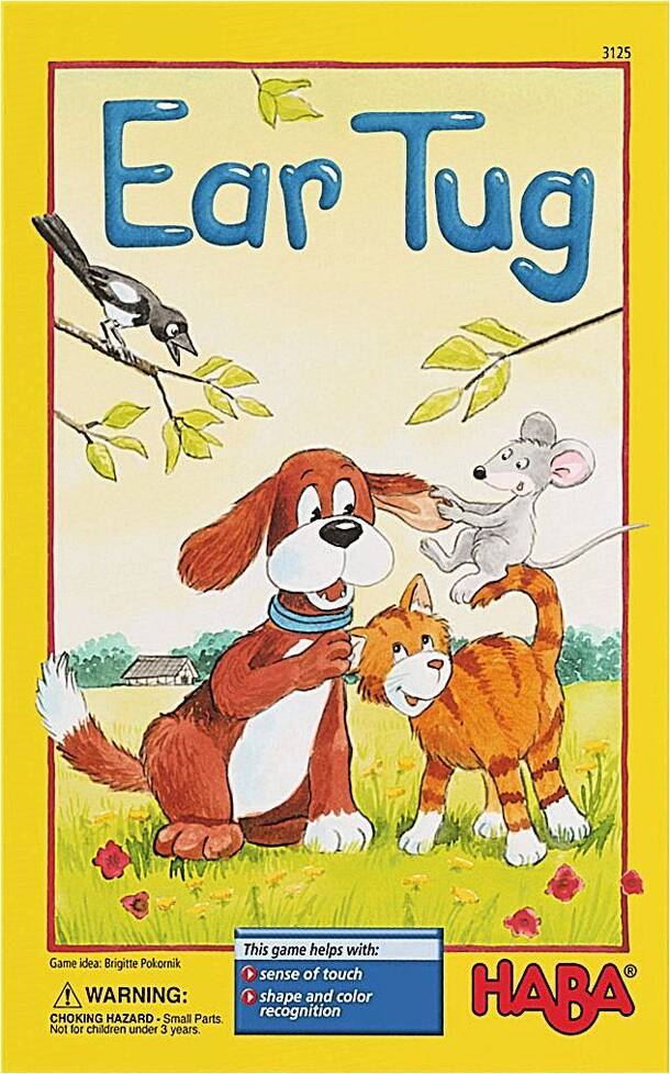 In Ear Tug the players pull colored wooden ear shapes from a bag and match them to cardboard tiles with animals on them. Rules for 3 games with this basic mechanism are given. In "My Ears, your ears" the players race to find the ears for their three animals. In "The hare has long ears" players collect animal tiles by finding both their ears. In Tic, Tac -...