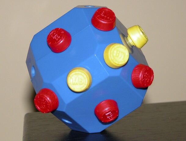 This is Connect4 played on a cube. The "cube" is about 3 inches on a side and cannot be accurately called a cube since the edges and corners are cut off at 45 degrees. It is made of the same blue plastic as the more common Connect4 game. Each of the 26 sides thus created has a hole in. The cube is hollow and one side is a door enabling red and yellow pegs...