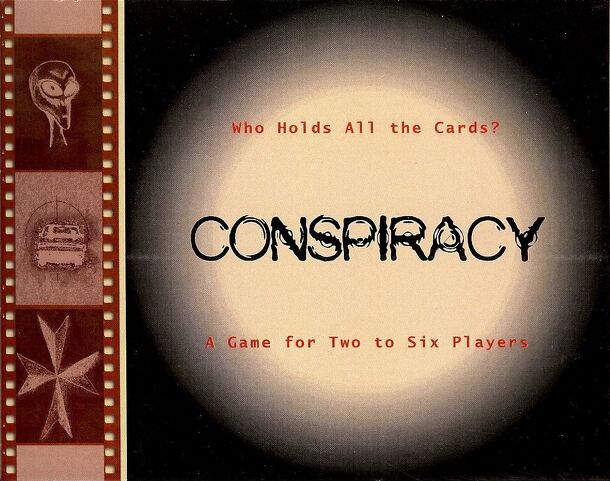 Box text: Prove that Nostradamus masterminded the Roswell incident from his secret base in the Bermuda Triangle. And other weirdness. Conspiracy theories make connections between the most unlikely combinations of people, places, artifacts, and events. win the game by constructing the most elaborate and outrageous conspiracy theory. Destroy your rival's...