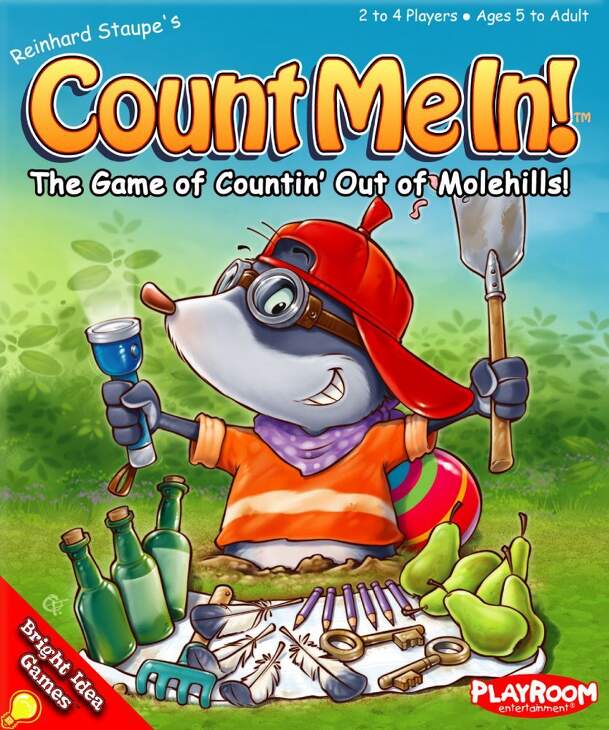 In Count Me In! – aka, 1, 2, 3 ... ganz viele! ("1, 2, 3 ... lots!") – players work together to try to lay down cards in the right order. If they complete two rows of ten cards each, they win. At the start of the game, shuffle the deck of fifty cards – five cards each with numbers 1-10, with ten different images appearing as pips on the cards: horseshoes...