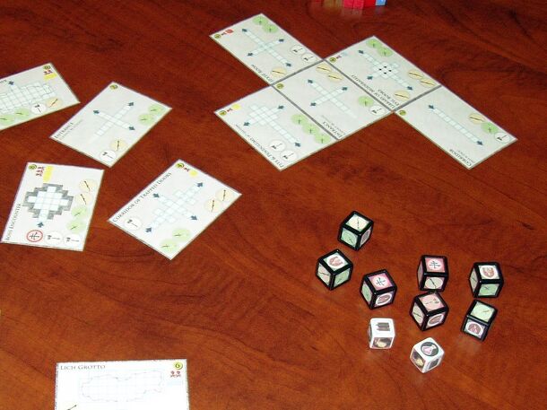In Dungeon Hustle, 2-4 players are archetypal fantasy characters running through a dungeon picking up swords, keys, shields, scrolls and potions. Each item comes in different colors, and to pick them up, you must hustle through a path of dungeon tiles of matching color; once you step on a new color (or a corner space), you pick up the tiles that you had...