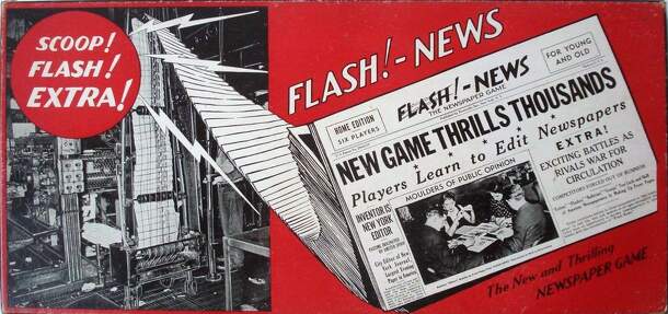 This is an elaborately accessorized 1937 newspaper game. Players compete to fill a blank front page with articles, matching headlines and pictures. The box is filled with glossy paper slips marked with a category on the back and either a headline or story on the front. The stories are actual news events from the time (including some false versions). In...