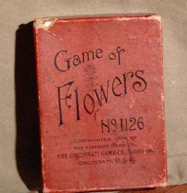 The title of this card game is "Game of Flowers" (NO. 1126) and was produced in 1899. Box measures approx. 3 3/4 by 3 inches and contains set of cards, each of which has a flower. Four suits,(A.B.C.D) 13 cards in a suit for a total of 52 per deck. Flowers are geraniums, pansies, lilacs, roses, begonias, carnations, cornflowers and sweet peas, among others...