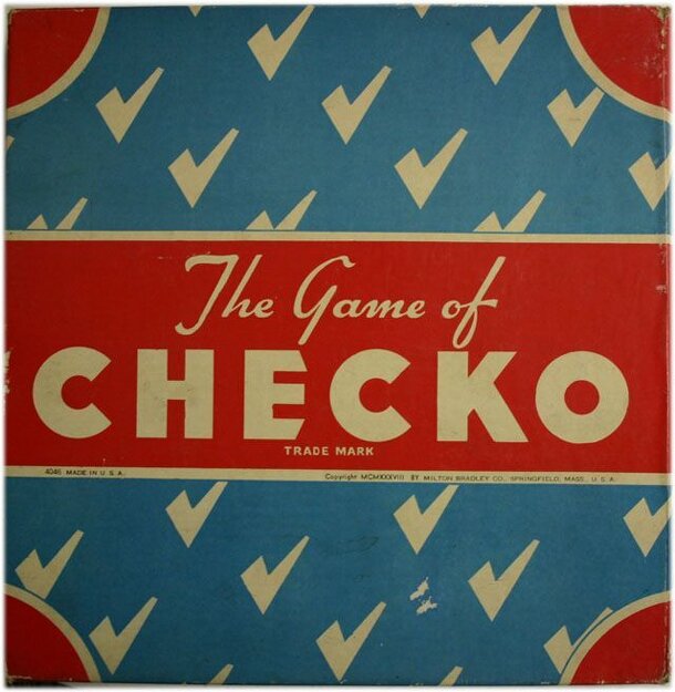 This is Milton Bradley game #4046, The Game of Checko, 1938. Object is to skillfully place CHECKS on the CHECKO Board so that each row horizontally, vertically and diagonally will produce the highest score possible. There are 8 CHECKO boards, 8 sets of colored CHECKS, each set having four of each number, 1 to 13. 1 Deck of CHECKO cards, four of each...