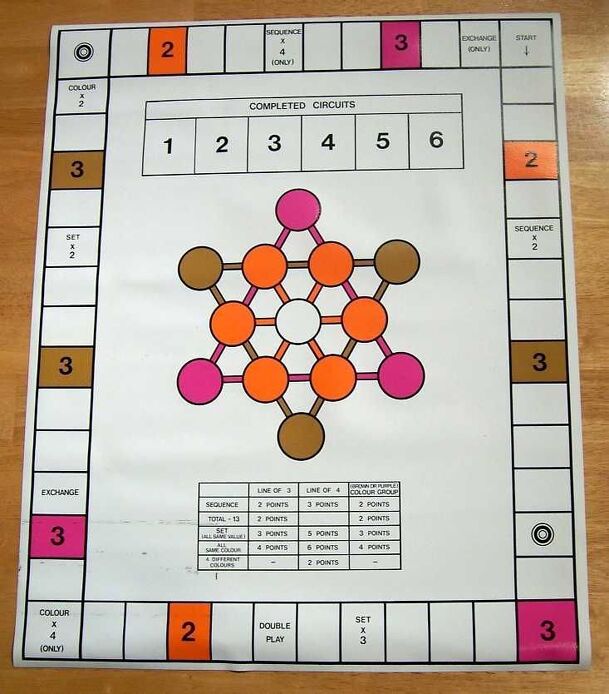 Four cards is placed in the middle of the players with the different color lines. In his turn player must place one of the three card from his hand on the table so that it follows the line and the sequence of decreasing or increasing numbers with the other cards on the table. If player can't play a card he draws a new card, places it if possible or passes....