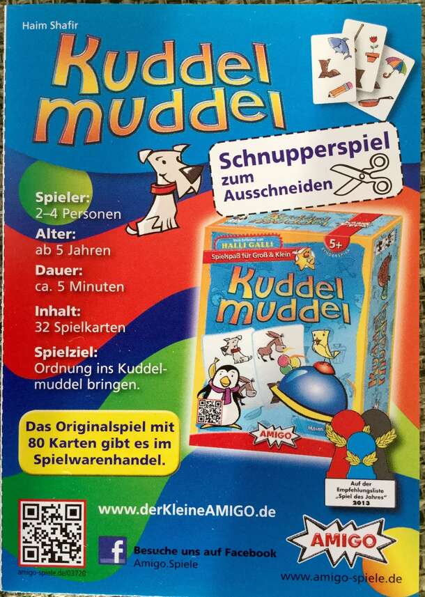There's a big mess on the table! Who can clean up the cards the fastest, while also lining up cards that match one another? In Kuddelmuddel – German for "hodgepodge" – players try to put together chains of cards in order to score points. To set up the game, the players scatter the 80 cards in the deck face down on the table and place the bell within reach...