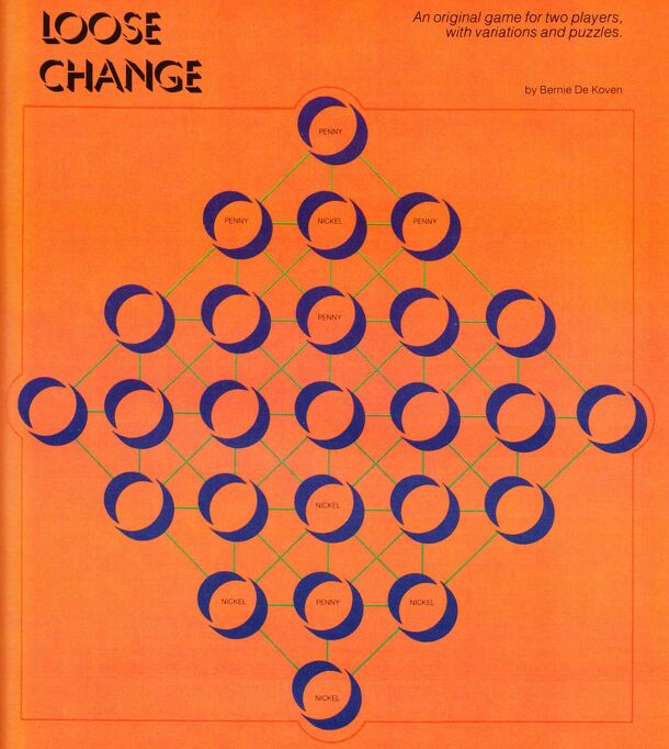 Loose Change is played on a diamond-shaped board of spaces with eight connections to their neighbors (except on the edges of the board). One player plays with four pennies and a nickel showing heads, the other with four nickels and a penny showing tails. On a turn a player moves any one of their coins any number of unoccupied spaces in any direction. The...