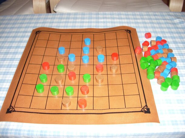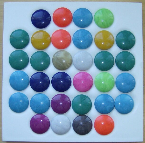 from the rules: Equipment A board with 32 indented spaces 32 stones of 11 colours (8+7+3+3+2+2+2+2+1+1+1) Two rules booklets. To Start At the start of the game, the 32 stones are spread randomly over the board surface so that all spaces are filled. The board is set between the players, leaving a space in front of each player. For MEM-Solitaire, you need...