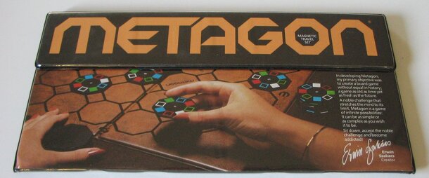 From the description on the back of the box: Metagon is a game of skill in which chance plays a small part. It can be played by two, four or six players either singly, in pairs or teams of three. The components of the game are 36 different octagonal tiles or metagons and a playing board. The object of Metagon is to gain tiles from the playing ground. This...