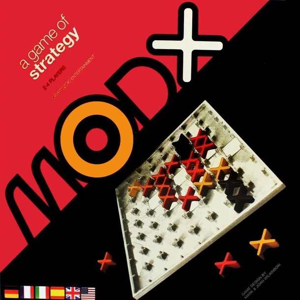 In the abstract strategy game MOD X, each player has 14 game pieces and 18 score markers, with the goal being to reach an established number of points (determined by the number of players). Players take turns placing a game piece on the board and trying to create scoring patterns – an "X", a "+", or a line, with each pattern requiring five pieces – while...