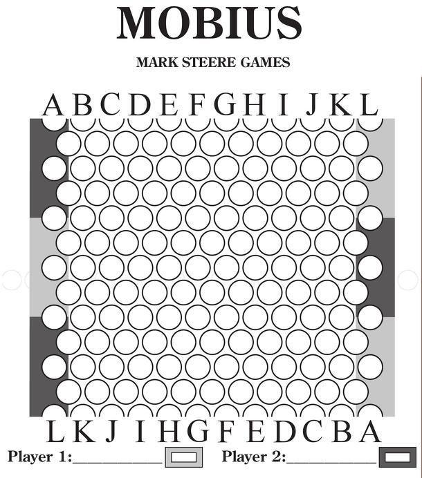 A connection game somewhat similar to Hex, the objective is to connect the three areas in your color on the ends of the board or to connect two areas and loop around the board. The board simulates playing on a Mobius strip, so the lower left corner connects to the upper right hand corner and so forth. The magazine includes a photo-copyable page of boards...