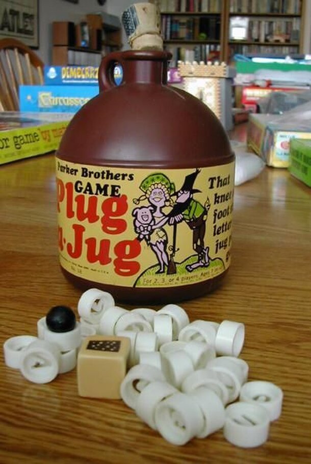 The object of the game is to be the first player to spell plug a jug. Players take turns rolling a six-sided die. The sides of the die show either a blank, a jug, or a cork. Players take turns rolling the die. When one player rolls a jug symbol they open the jug and shake out the small plastic letters and try to spell "plug a jug." While they are doing...