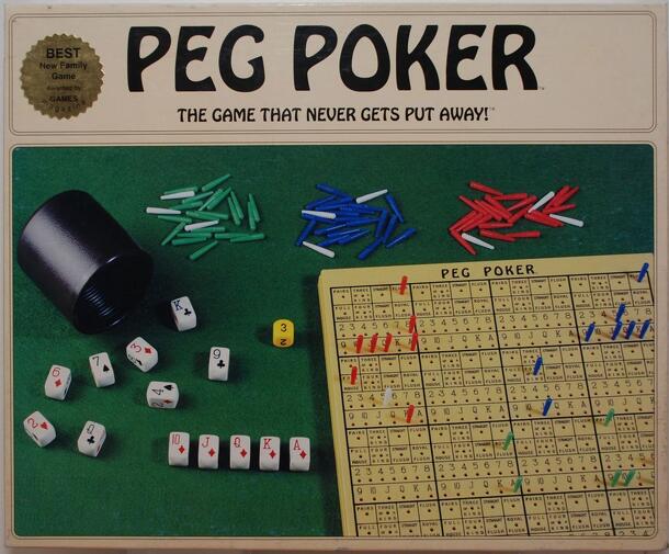 Yahtzee meets Poker meets Tic-Tac-Toe. The game board is a 4x4 grid and in each cell lies a record-keeping area noting eight possible poker hands and one hole for each card from 2 through ace. Players take turns rolling 13 6-sided dice to generate five-card poker hands (choose the best "cards"). They also roll a randomizer die which tells them how many...