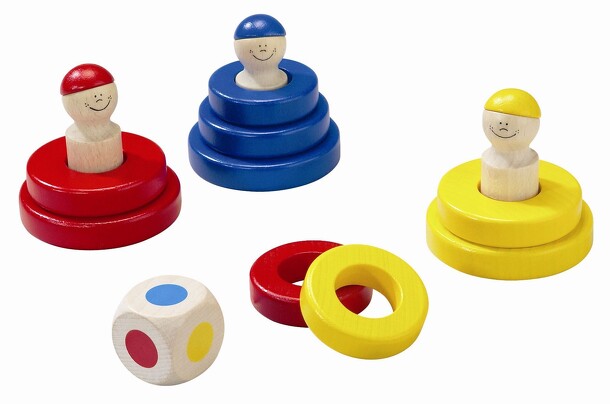 Dear Parents: This game contains four variations on which your child can play and learn. • Free game without rules for very little ones. • Three simple dice games of different degrees of difficulty Variation: Free game Die game 1: “Which colors suit me?” Die game 2: “Ring up to me!” Die Game 3: “Colorful ring tower” Contents: 3 ring-a-thing manikins (in...