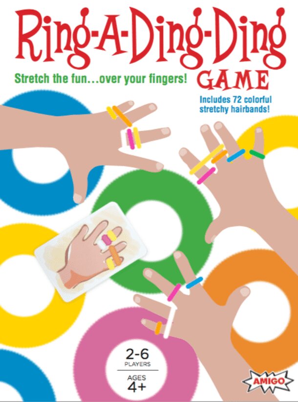 Haim Shafir and Jeanie Gadish's RinglDing takes speedy pattern-recognition games to a fashionable new level. To set up the game, players place a bell in the center of the table, shuffle a deck of cards, and lay out 72 elastic hair bands within reach of all the players. One card is revealed, and players race to assemble the right combination of hair bands...