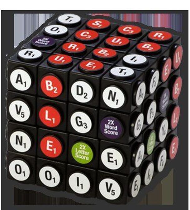 Scruble Cube (Swedish and Finnish: Alfapet Twist) consists of a 4x4x4 Rubik's Cube, except a letter (along with the letter's point value) appears on each exposed side of each sub-cube. These letters are attached on circular pegs that freely rotate. This enables you to rotate each letter so that you can spell words in any direction. Players have 90 seconds...