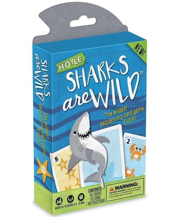 Sharks are Wild reinforces sequencing: counting both forwards and backwards. Each player starts with a number 5 “starter card” on the table and an open hand of five cards (numbers 0-4, 6-9, and wild). On his turn, a player draws a card, then either plays a card into his sequence or discards. Once a player has achieved a sequence of five cards (including...