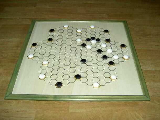 Starweb is a placement game without movement or capture. Players take turns to place one stone. The starshaped board has 18 corners, 12 outward and 6 inward ones. Groups containing corners have a value of 1 point for one corner, 2 points for the second corner, 3 for the third and so on. A group containing 4 corners thus has a value of 1+2+3+4=10 points....