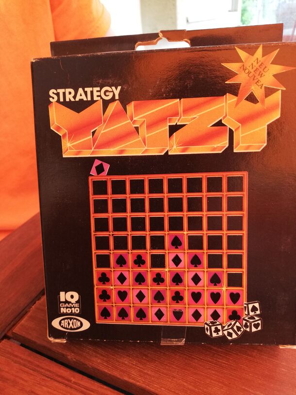 This game is not related to the classic dice game Yatzy (better-known as Yahtzee). The game consists of an 8 x 8 grid in a vertical frame, similar to Connect Four but only accessible from one side. The players roll four dice and insert four chips into the board with symbols corresponding to the results (the symbols are hearts, clubs, spades, and diamonds)....