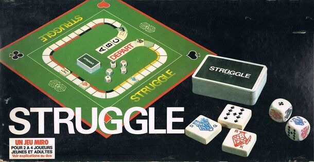 Struggle: A live game, full of surprises. Five common chips are used in turns by each player, which make them move by rolling the dice, but each players seeks a different arrival pattern, imposed in the beginning by drawing a secret card. Certain areas impose specific rules. When the five chips reach the end each players scores 10 points for each well...