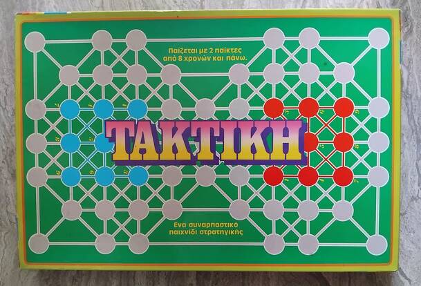 Take-Back-Toe is a short abstract strategy game for two players. Starting with a central row of ten chips on four adjacent spaces, players try to move chips to create three stacks of equal height on their side of the board. On a turn, a player rolls a six-sided die, then moves a stack of exactly that many chips to an orthogonally adjacent space on the 3x4...